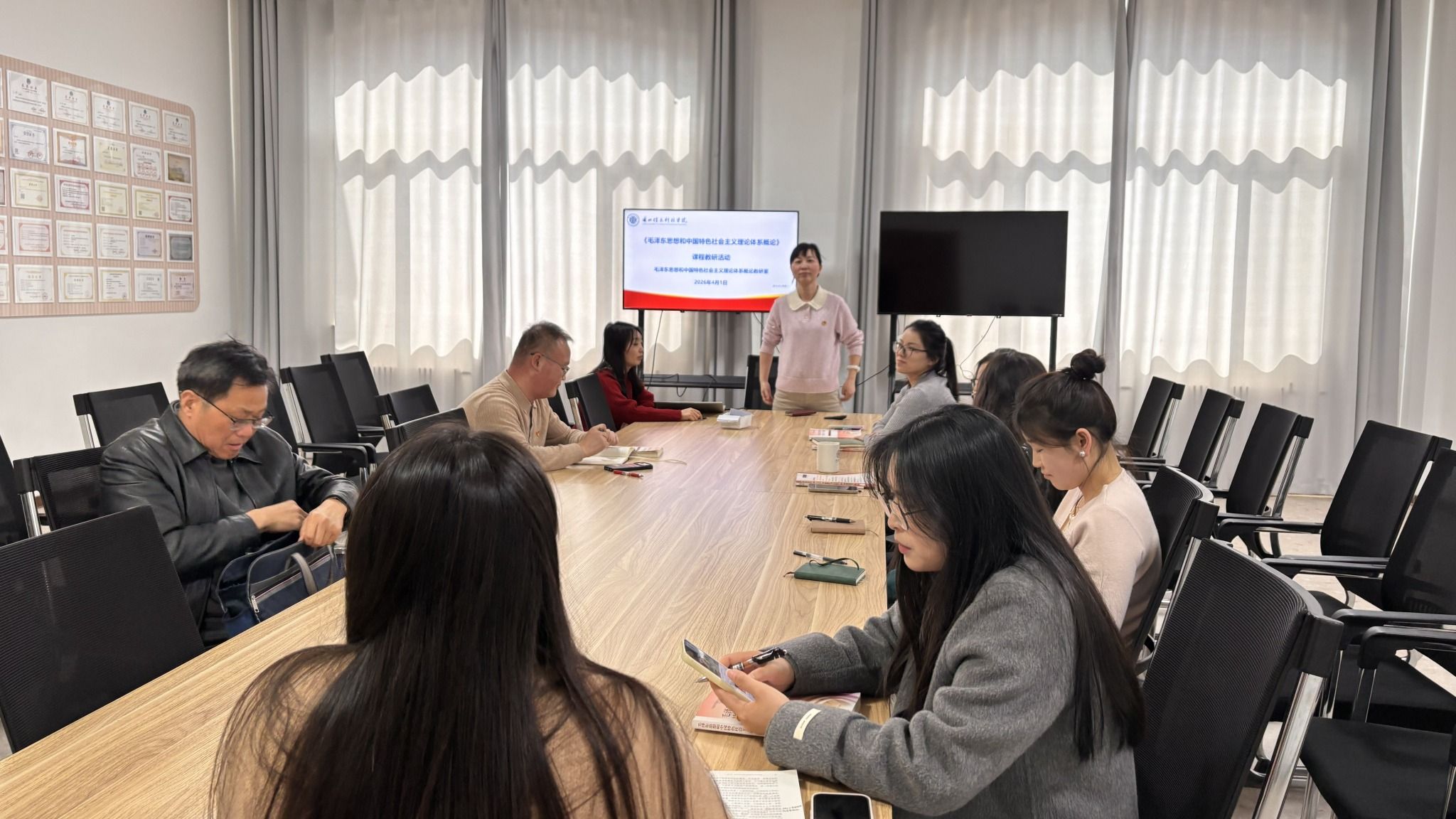 为深入学习贯彻落实SC教学改革理念,推动其深度融入本学期开设的相关课程,切实转化为育人实效。4月8日,兰州信息科技学院马克思主义学院全体教师在学院214会议室召开专题教学研讨会,胡小燕老师围绕SC教学改革倡导的多元互动理念,以及BOPPPS教学模式的实践要求,作《毛泽东思想和中国特色社会主义理论体系概论》课程专题分享,为全院思政课教学创新提供了可复制、可推广的实践范本。